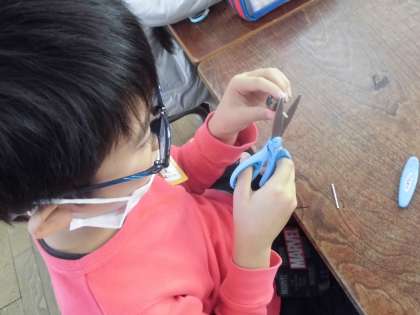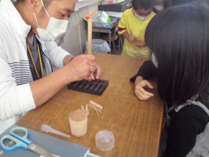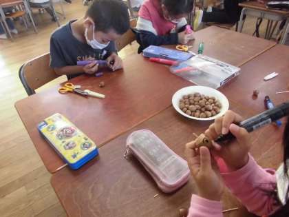 2年生はどんぐりで「どんぐりごま」を作りました。担任にどんぐりに穴をあけてもらい、つまようじを刺してはさみで適度な長さに切っていきます。最後に色ペンで顔の絵を描いたり模様付けをしたりして完成です。楽しい作品がどんどんできていきました。