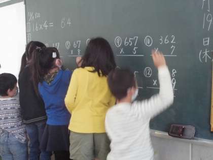 3年生はかけ算の筆算を学習しています。手を挙げて当ててもらい、筆算の答えを黒板に書いていきました。書き終わったらにっこりとした笑顔になって自信を深めました。