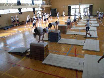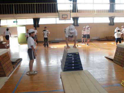6年生は跳び箱で「閉脚跳び」を練習しました。跳ぶ時の様子をペアになった子に見てもらい、アドバイスや足や手の様子を伝えてもらいました。自分の課題を知ることにより、みんな少しずつ上達していきました。