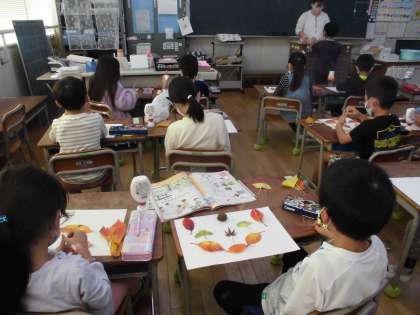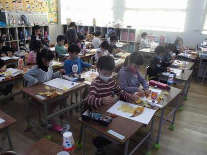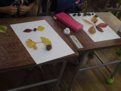 1年生は落ち葉を画用紙に貼って作品を作りました。落ち葉だけでなく、子どもたちが拾ったどんぐりの「はかま」も使っていきました。この時期らしい秋の作品ができていきました。