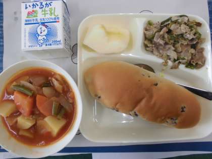 11月20日の給食は「豚肉のカレー風味焼き」「ケチャップ煮」で、デザートにりんごがでました。パンはレーズンパンです。」「ケチャップ煮」は野菜いっぱいでした。
