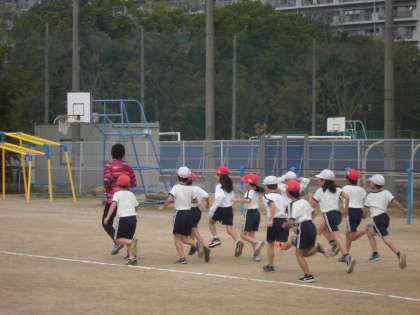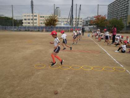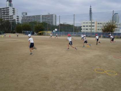 3年生は住之江区役所と連携して「NOBY」プログラムを実施しました。「NOBY」プログラムは元アスリートの方から陸上運動を教えてもらう活動です。はじめは輪を使って「踏む意識」を高めていきました。