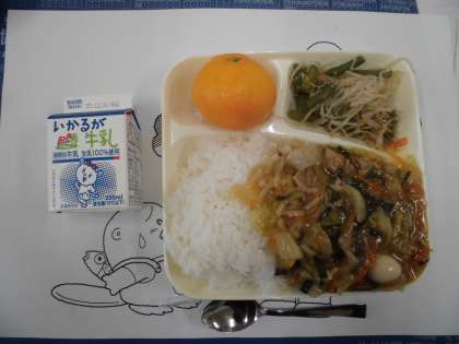 11月25日の給食は「中華丼」「もやしと三度豆の中華和え」でデザートにみかんが出ました。「中華丼」はうずら卵の個別対応献立で、卵アレルギーに配慮しています。