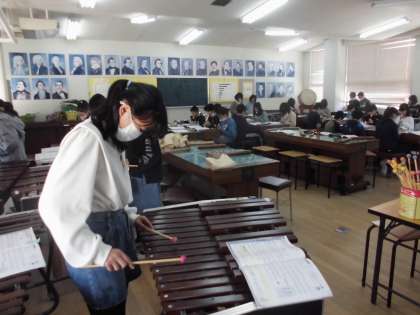5年生は「威風堂々」の合奏の練習です。自分で選んだ楽器を演奏し、みんなで音を合わせて演奏の練習をしていきました。練習を重ねていくとどんどん上達して5年1組のすばらしい音にしていくことでしょう。