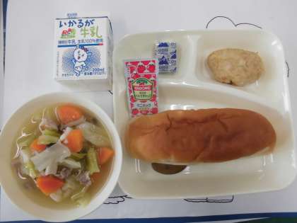 12月最初の給食は「とうふハンバーグ」「カリフラワーのスープ煮」「固形チーズ」です。ハンバーグはケチャップでいただきました。パンはやわらかいおさつパンです。