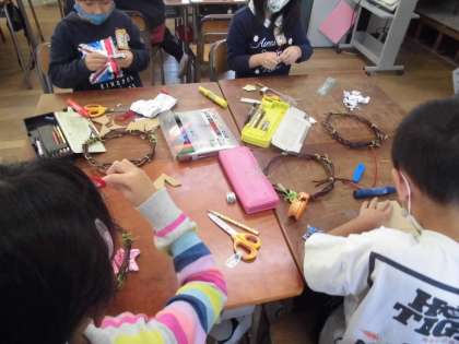 2年生はクリスマスリース作りをはじめました。学習園で収穫したさつまいものつるを使ってリースの基礎を作っていき、飾りをつけていきました。これからいろいろな飾りを作って完成を目指します。