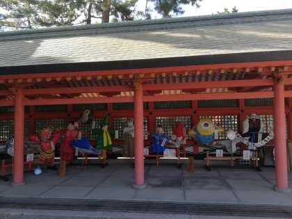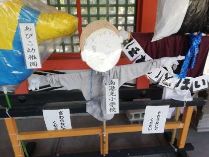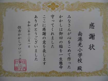 5年生が住吉大社からいただいた稲を育てて収穫したことはすでに紹介しましたが、5年生が作ったかかしが住吉大社の御田を守っていました。御田の収穫が終わった後は、かかしは住吉大社の境内にかざってもらい、七・五・三等でお参りに来られた方々に見てもらっていました。今日、そのかかしが本校に帰ってきて、感謝状をいただきました。5年生のがんばりに励みになることでしょう。