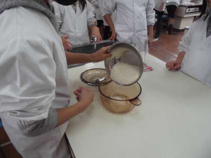 5年生はご飯を炊く学習をしました。学習園の田で収穫したお米です。感染予防のため、子どもたちが※をさわらないように、あらかじめ担任が米をといて用意をしていました。子どもたちは鍋に米を入れて水を入れました。続きは明日に紹介します。