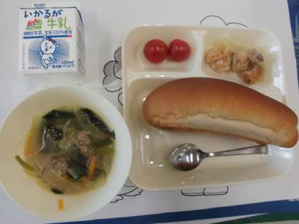 12月3日の給食は「さけのマリネ」「肉だんごと麦のスープ」でプチトマトがでました。パンは黒糖パンです。