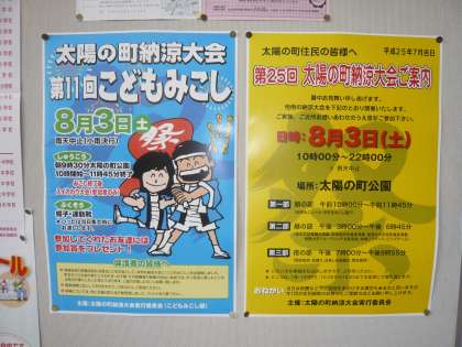 8月3日(土)は、第25回太陽の町納涼大会です。朝、昼、夜の部に分かれていて、丸一日のおまつりです。子どもたちは朝の部(午前10時から11時45分)の子どもみこしで参加します。昼の部は、住の江幼稚園や南港北中学校、咲洲高校、相愛大学、フラダンスの演技や演奏があり、夜の部は盆踊りです。その間、多くの団体による模擬店が出されます。