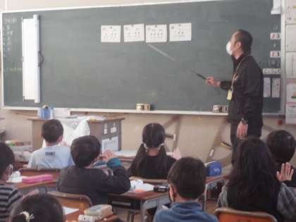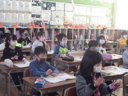 2年生は音楽でリズム打ちの学習です。慣れてくるとリズムを変え、子どもたちはいろいろなリズムを正確に打とうとがんばっていました。