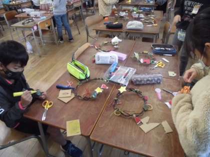 図工ではリース作りです。いろいろな楽しい飾りが増え、完成が楽しみです。