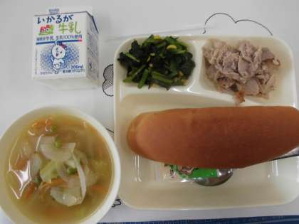 12月7日の給食は「豚肉のガーリック焼き」「スープ」「ほうれん草のソテー」です。コッペパンはソフトマーガリンでいただきました。
