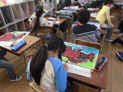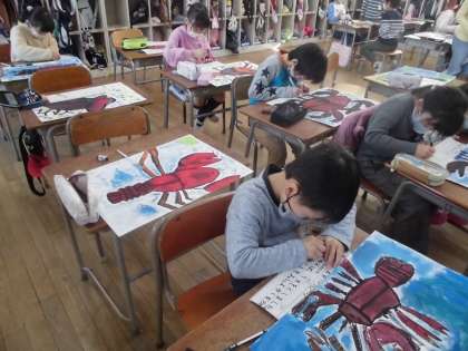 2年生は作品展の絵の名札を作りました。文章をよく考えていました。担任に文章を見てもらい、よりわかりやすいように書きかえていました。