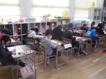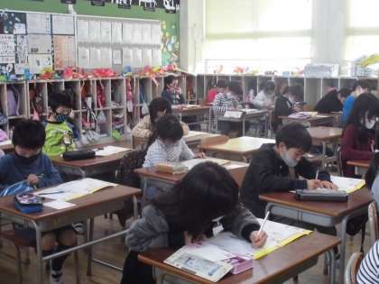 2年生は年賀状の書き方を学習しました。年賀状のあいさつの言葉やはがきの書き方を教えてもらいました。教科書の手本をていねいに写していました。