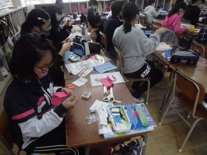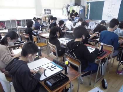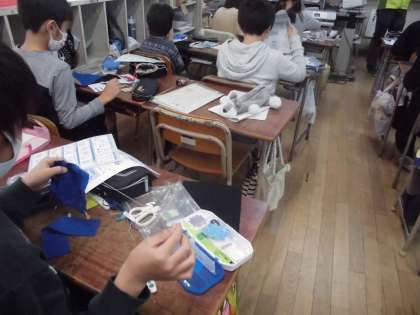5年生は家庭科で「小物作り」に取り組んでいます。針と糸を使って作成していきます。なかなか難しいようです。習字では「出発」を書きました。どちらも手を上手に動かさないといけないので、慎重になっていました。