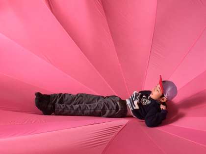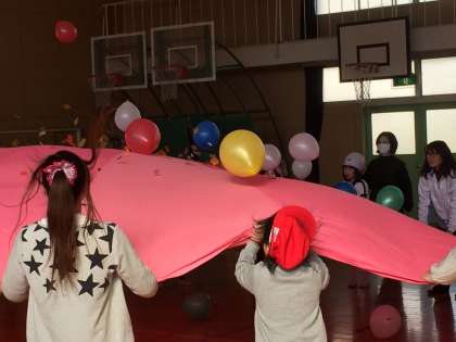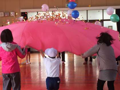 みんなでパラバルーンで楽しみました。先生もいっしょに大きなバルーンをふくらませました。