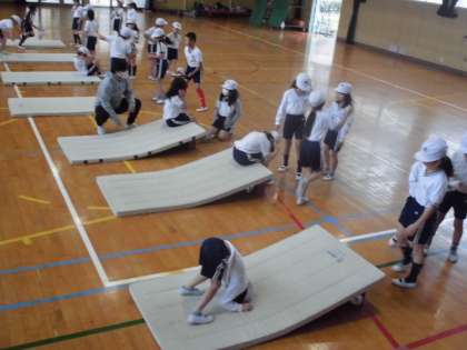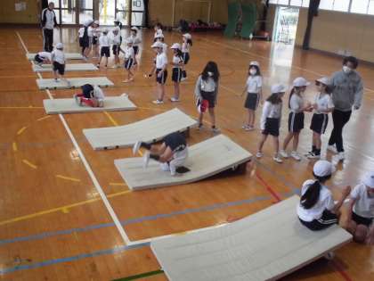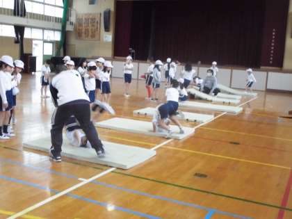 以前から2年生はマット運動の後転を練習しています。今日は写真のようにマットで斜面を使って練習をしました。効果は多大で、斜面ではほとんどの2年生ができ、平面でも半分以上の2年生が後転ができるようになってきました。