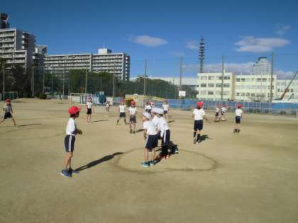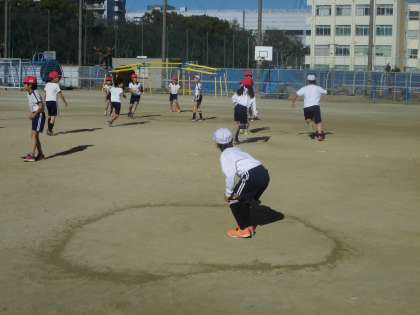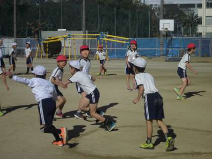 3年生は厳寒の中、運動場で体育をしました。「島鬼ごっこ」といって運動場に描かれたサークルに入っていればセーフで、島を移動していきます。移動中にタッチされたらアウトになるゲームです。相手の動きを予想しながら頭を使って駆け引きをする楽しい鬼ごっこです。進めるうちに体が温かくなっていきました。
