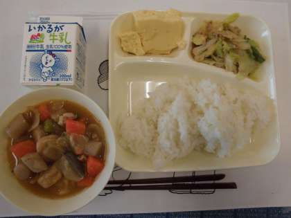 12月16日の給食は「卵豆腐」「鶏肉と一口がんもの煮物」「野菜のそばろいため」という昨日に続いての和食献立です。今日もご飯によく合う味付けでした。