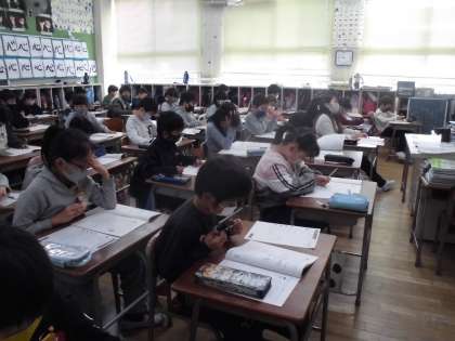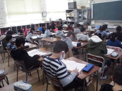 3年生は「経年調査」に向けて昨年度の問題(理科)に取り組みました。3年生にとって「経年調査」は初めての取り組みです。慣れないテスト内容に戸惑いながらも真剣に問題を解いていました。