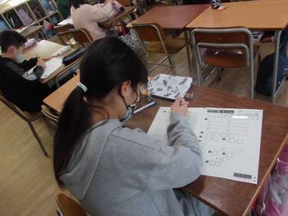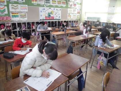 4年生も昨年度の「経年調査」(算数)を解きました。「経年調査」は単元テストに比べて出題範囲が広く、問題も簡単ではないので子どもたちはむずかしそうな顔つきで問題に向き合っていました。