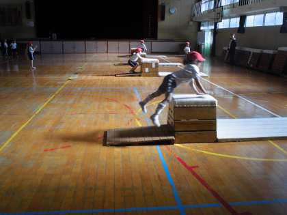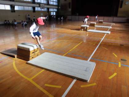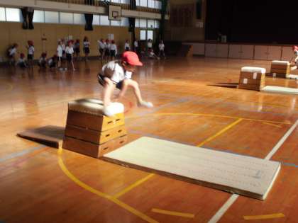 1年生は跳び箱の学習です。跳び箱に乗る練習から段階を追って練習していきました。うまく開脚跳びまで進むことができる1年生もいて、上達が早いです。