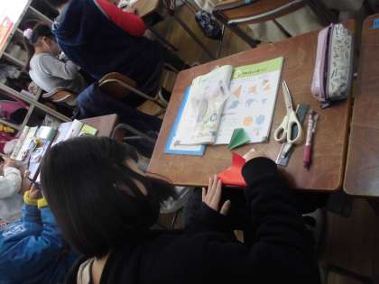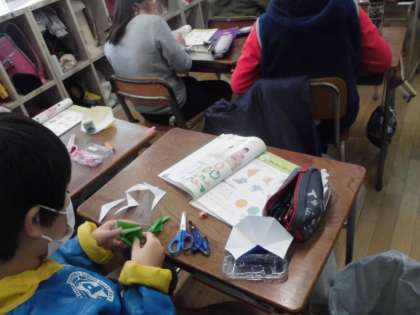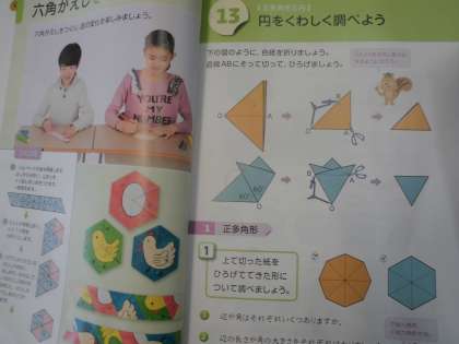 5年生は算数で円の性質について調べました。折り紙を切って角度などの円の性質について調べていきました。