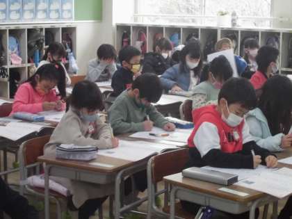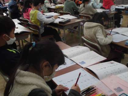 1年生は書初めをしました。毛筆は3年生からなので鉛筆で書いていきました。教科書の手本をよく見てていねいに書いていました。