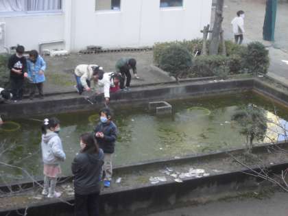最近の寒波で、大阪も寒さが続いています。昨日に続き、校庭の池に氷が張りました。