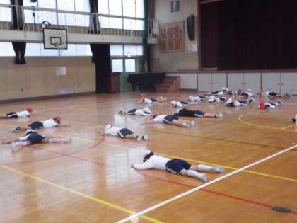 1年生は体をさっと動かす運動に取り組んでいました。うつぶせになって待機し、担任の合図でさっと腕立ての姿勢になりました。体を素早く動かす力を育てました。