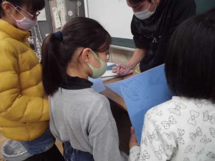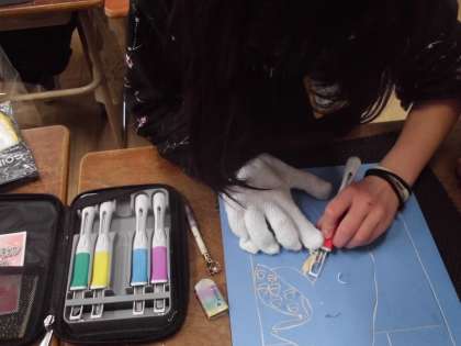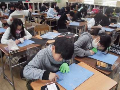 4年生は版画に取り組んでいます。題材は国語で学習した「ごんぎつね」です。担任に下絵を確認してもらい、彫り始めました。手袋をしてけがを防止しています。