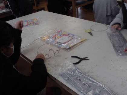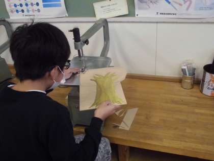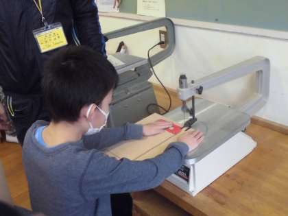 5年生は木工で伝言板作りをしています。電動のこぎりを使って形を切っています。どんな作品になるか楽しみです。