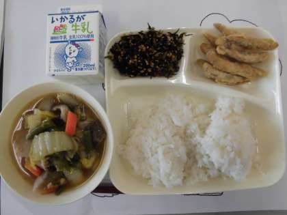 1月27日の給食は「いわしのてんぷら」「あつあげと野菜の煮もの」「ごまひじき」の和食です。ごまひじきはご飯によく合う味でした。