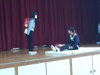今日は、放送委員会の発表がありました。放送委員の一日を劇にしました。朝はみんなより早く登校します。