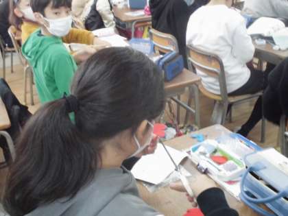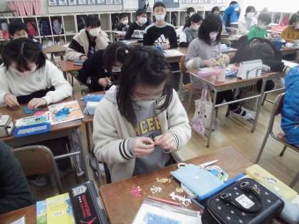 5年生の家庭科で作成している小物も仕上がってきました。はさみや針を使ってていねいに作品を作っていきました。
