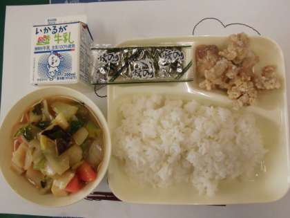 2月最初の給食は「鶏肉のからあげ」「まる天と野菜のうま煮」「焼きのり」です。