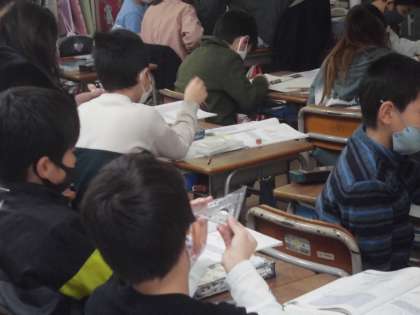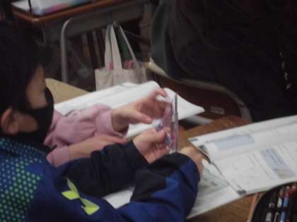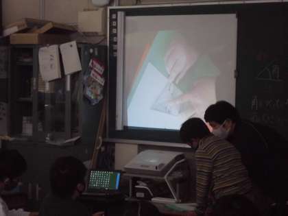 3年生は三角定規を使っての学習です。三角定規の角を合わせて角度を調べ、みんなの前で発表していきました。