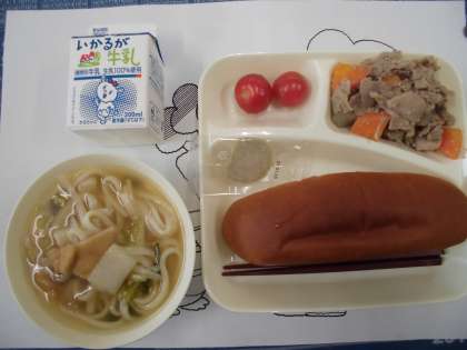 2月4日の給食は「豚肉とごぼうの煮物」「なにわうどん」でプチトマトが付きました。なにわうどんはだしがよく効いており、とろろ昆布に合う味付けでした。