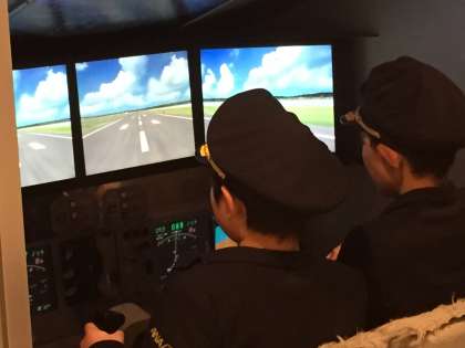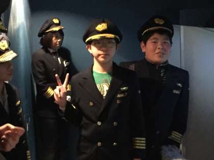 フライトシミュレーターで大空を飛びました。かっこいい制服姿でコックピットに座って、テイクオフ!