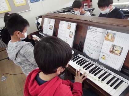 2年生はオルガンの練習です。「緊急事態宣言」中は鍵盤ハーモニカを一斉に吹くことができず、オルガンで曲を弾いています。今日の曲は「こぎつね」です。指使いに気を付けて慎重な面持ちで弾いていました。