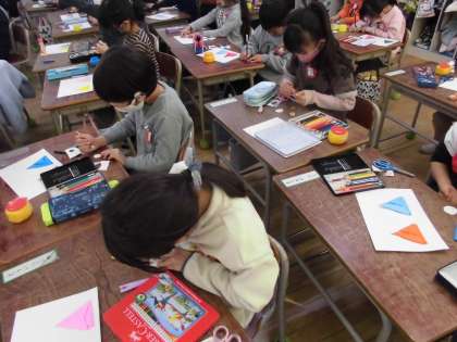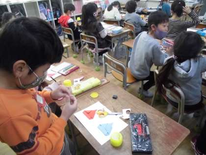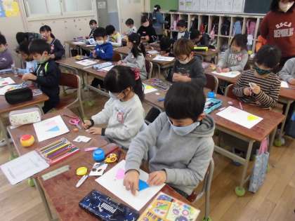 1年生は折り紙を使って「ひな人形」を作りました。ていねいに紙を折ったり切ったりして自分らしい「ひな人形」を作成していきました。