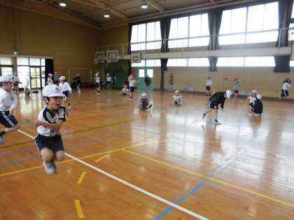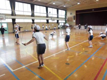 3年生は縄跳びの学習です。始める前に足でリズムをとる練習をしていきました。交差跳びなど難しい技も上達してきました。