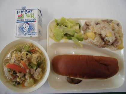 2月17日の給食は「中華おこわ」「卵スープ」「キャベツとピーマンのいためもの」です。パンは黒糖パンです。「中華おこわ」は栗がたくさん入っていて子どもたちも喜んでいました。