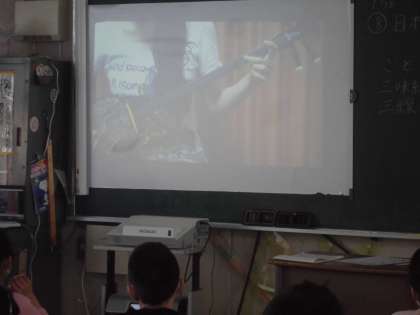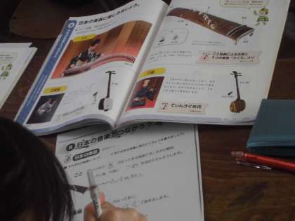 4年生は音楽で琴や三味線などの日本の楽器について学習しました。動画で沖縄の三線(さんしん)の演奏を見るなど、目と耳を使った学習です。