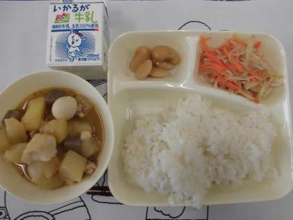 2月最後の給食は「関東煮」「甘酢あえ」「白花豆の煮もの」です。関東煮のうずら卵はアレルギーに配慮した個別対応給食です。