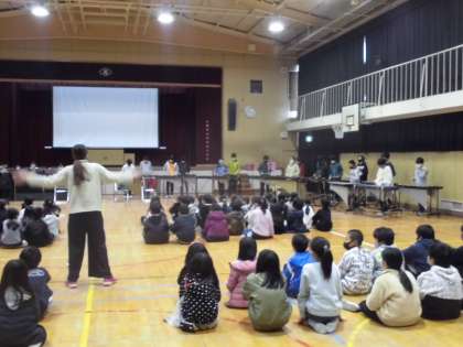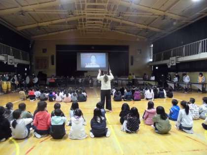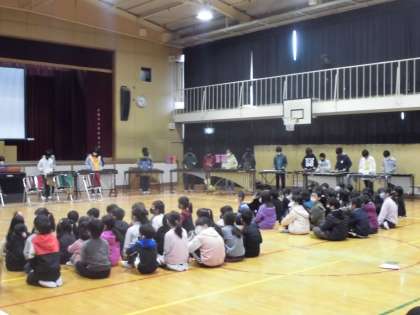 続いて6年生が合奏です。まず「ラバーズコンチェルト」です。舞台のスクリーンに6年生一人一人から在校生に励ましのメッセージ動画が写されました。