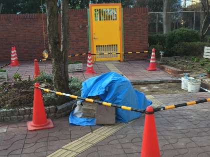 本校の正門から校舎にかけては、ブロックが埋め込まれています。それがどうしてもがたがたになり、小さな段差になっていました。それを解消するための改修工事を行っています。