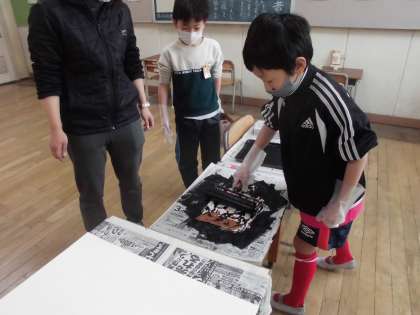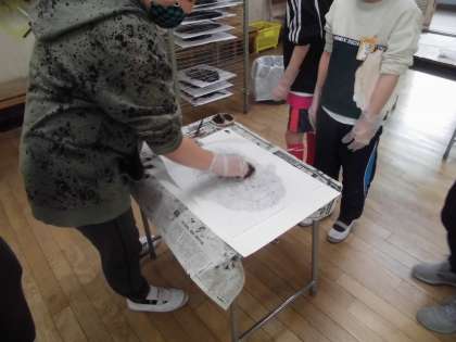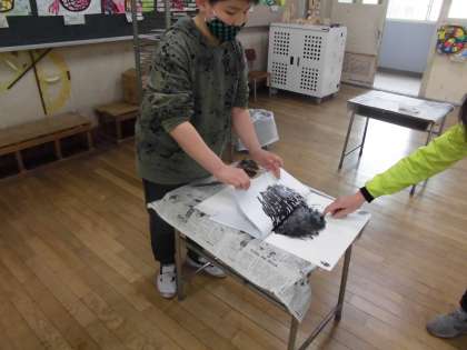 3年生は紙版画を仕上げています。顔を版画にし、インクを均等につけて刷っていきました。出来上がった作品を見て笑顔になりました。