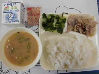 3月12日の給食は「豚肉のしょうが焼き」「豆腐のみそ汁」「なのはなのおひたし」です。なのはなが出ることで春の訪れを感じました。